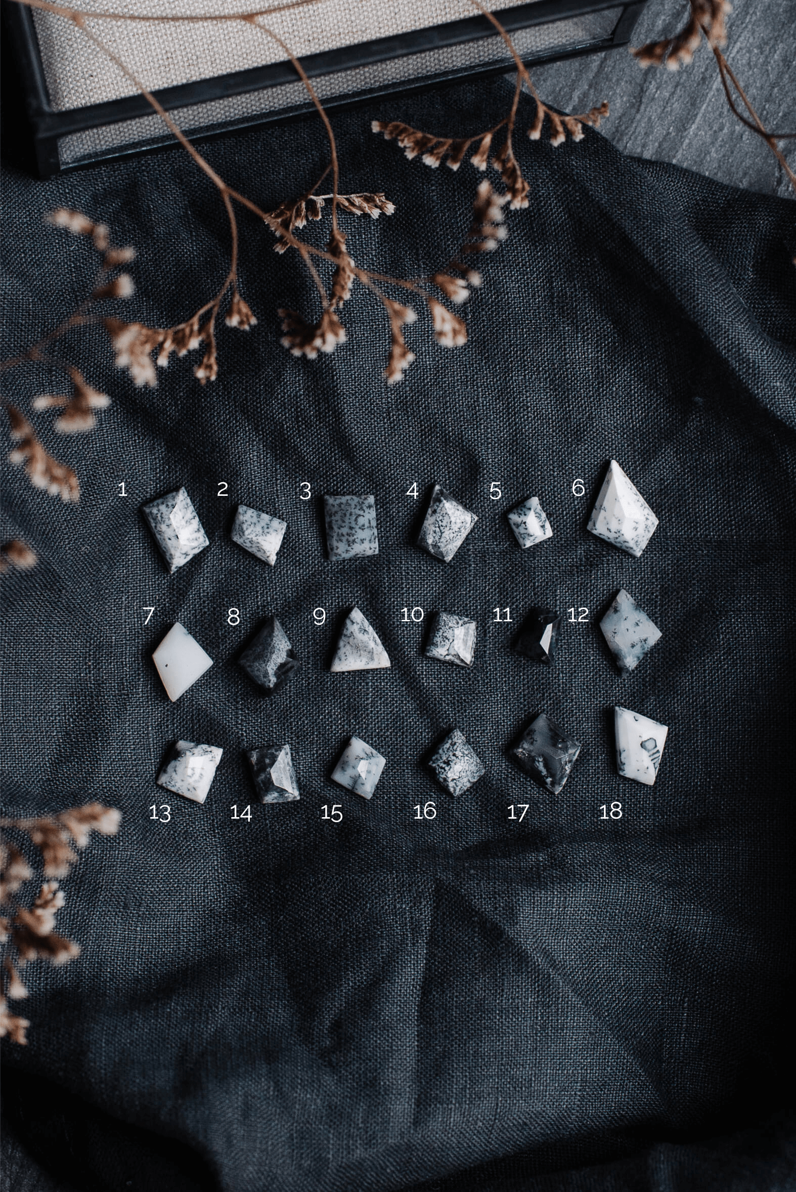 Each dendrite opal is a natural gemstone in shades of white, grey, and dark grey. The tiny quartz gemstones vary from clear to dark grey and are chosen to complement the main stone.